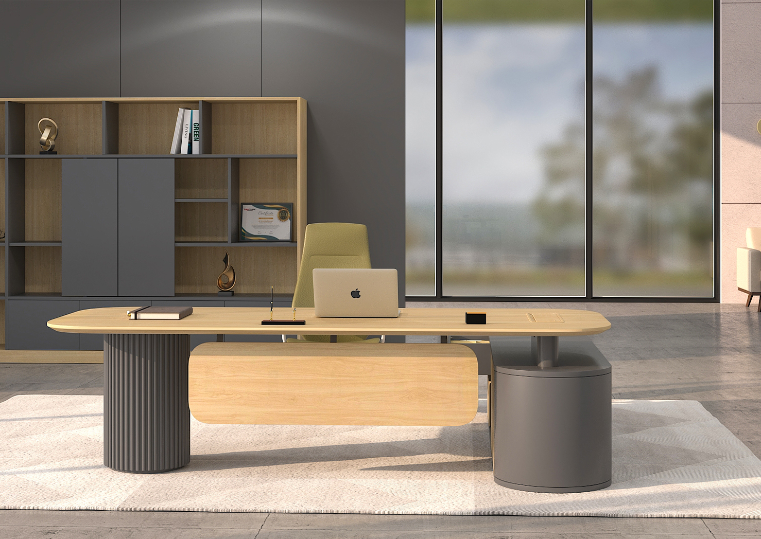 This cabin table embodies fluid elegance with soft-edged surfaces and sculptural fluted columns that add depth and texture to the executive space. Its curved credenza creates a seamless connection between work and storage, enhancing the sense of balance and movement