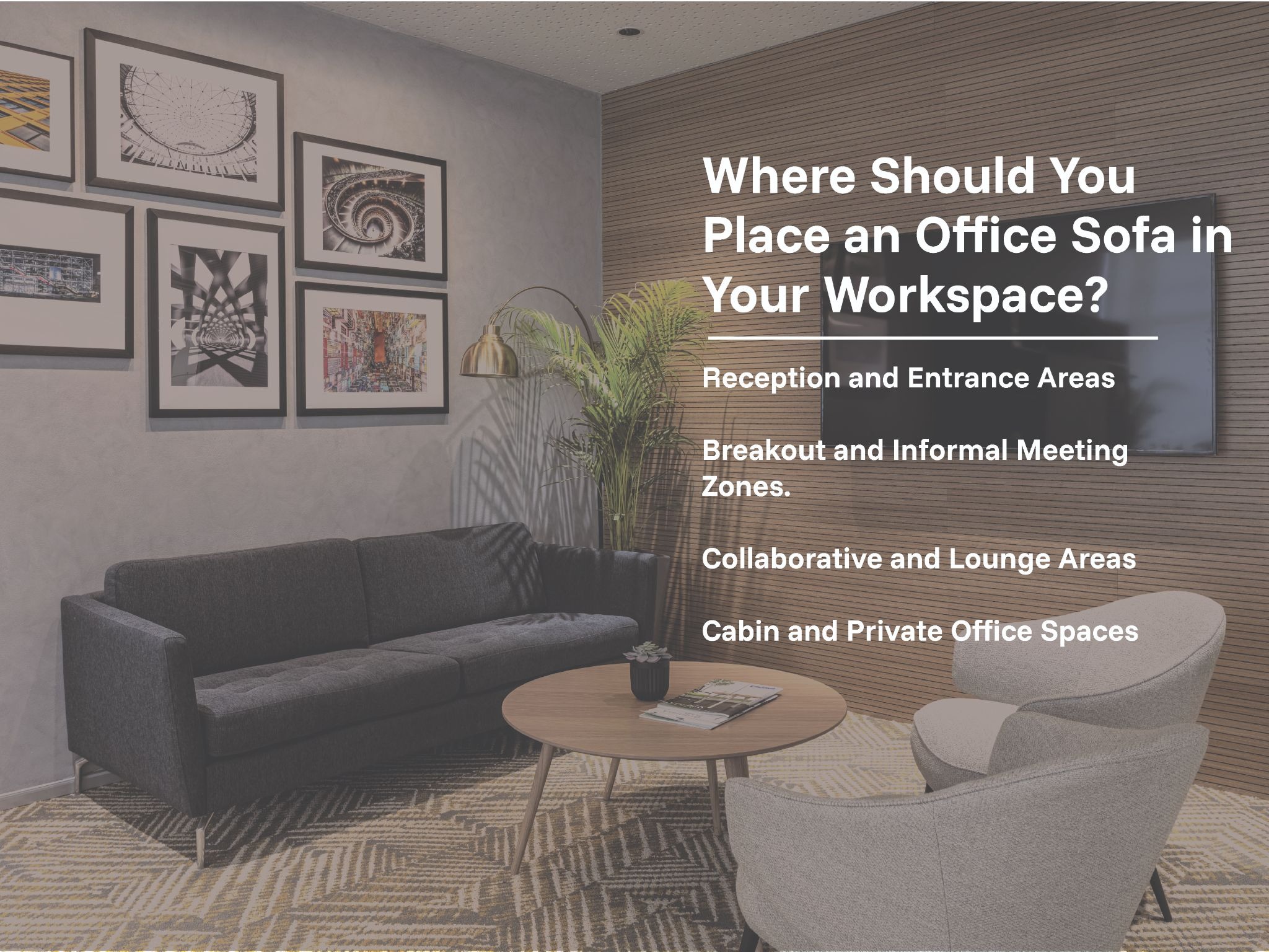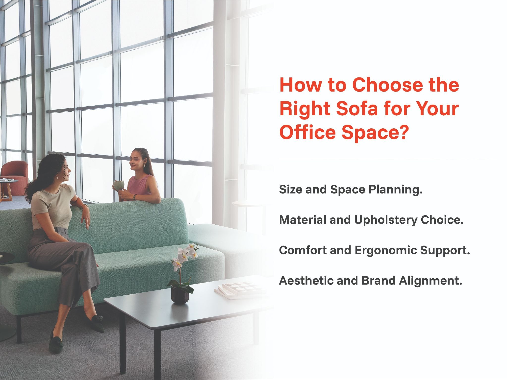 The size must be proportional to the zone it occupies. A large three-seater sofa in a compact breakout corner overwhelms the space; a small two-seater in a spacious reception area looks underwhelming.