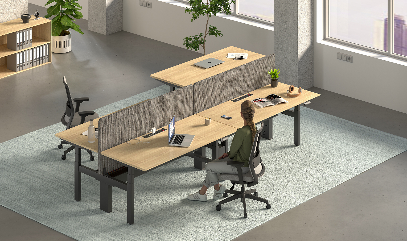 The desk transitions seamlessly between sitting and standing positions, supporting healthier postures and dynamic workflows throughout the day.