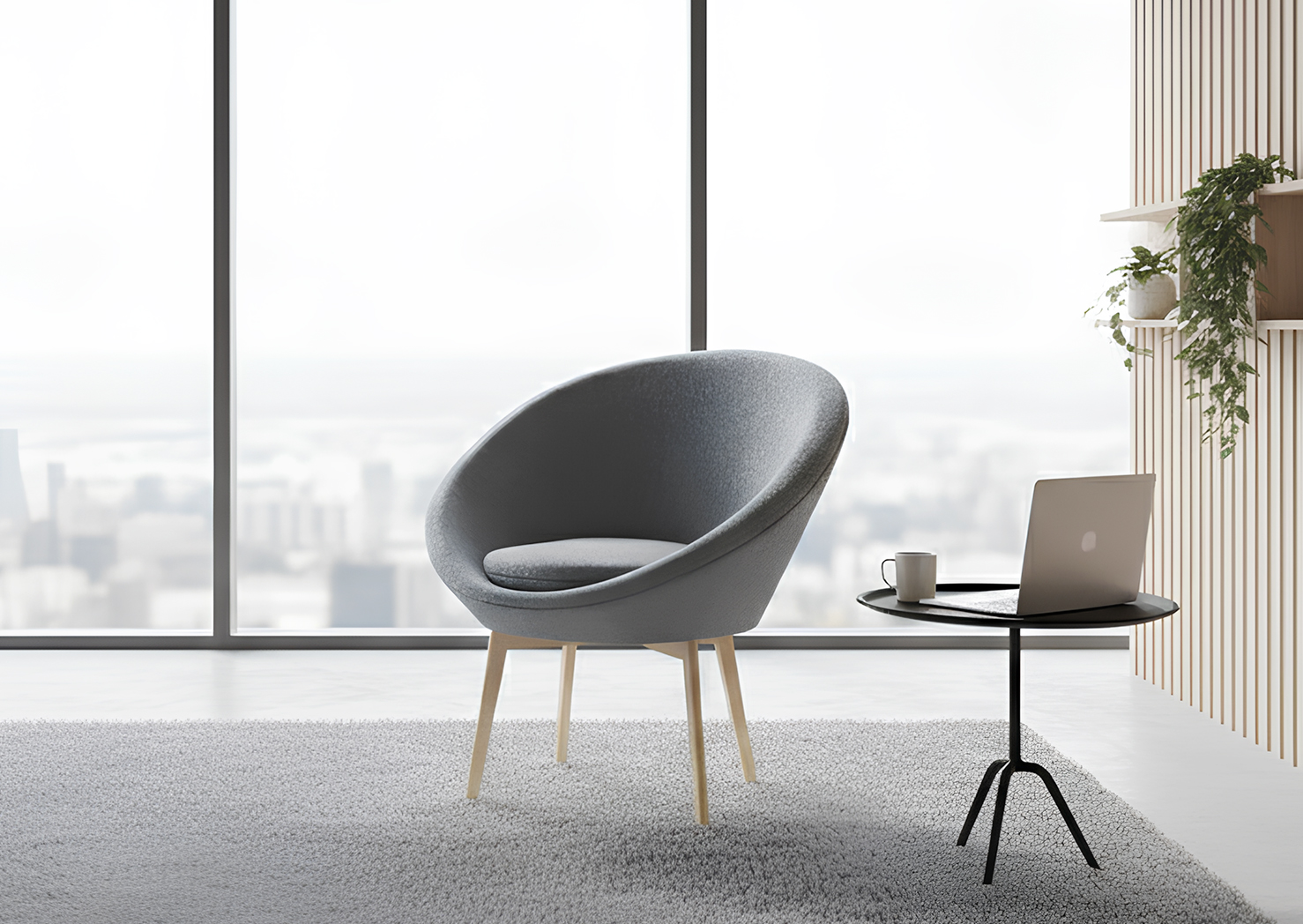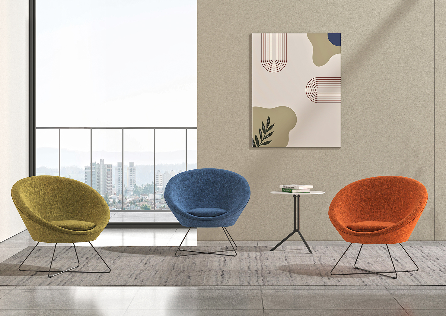 This lounge chair features a smooth, rounded upholstered shell paired with a sturdy metal swivel base for effortless movement. Stylish, comfortable, and versatile—perfect for elevating modern lounges, offices, or collaborative spaces in any brochure showcase.