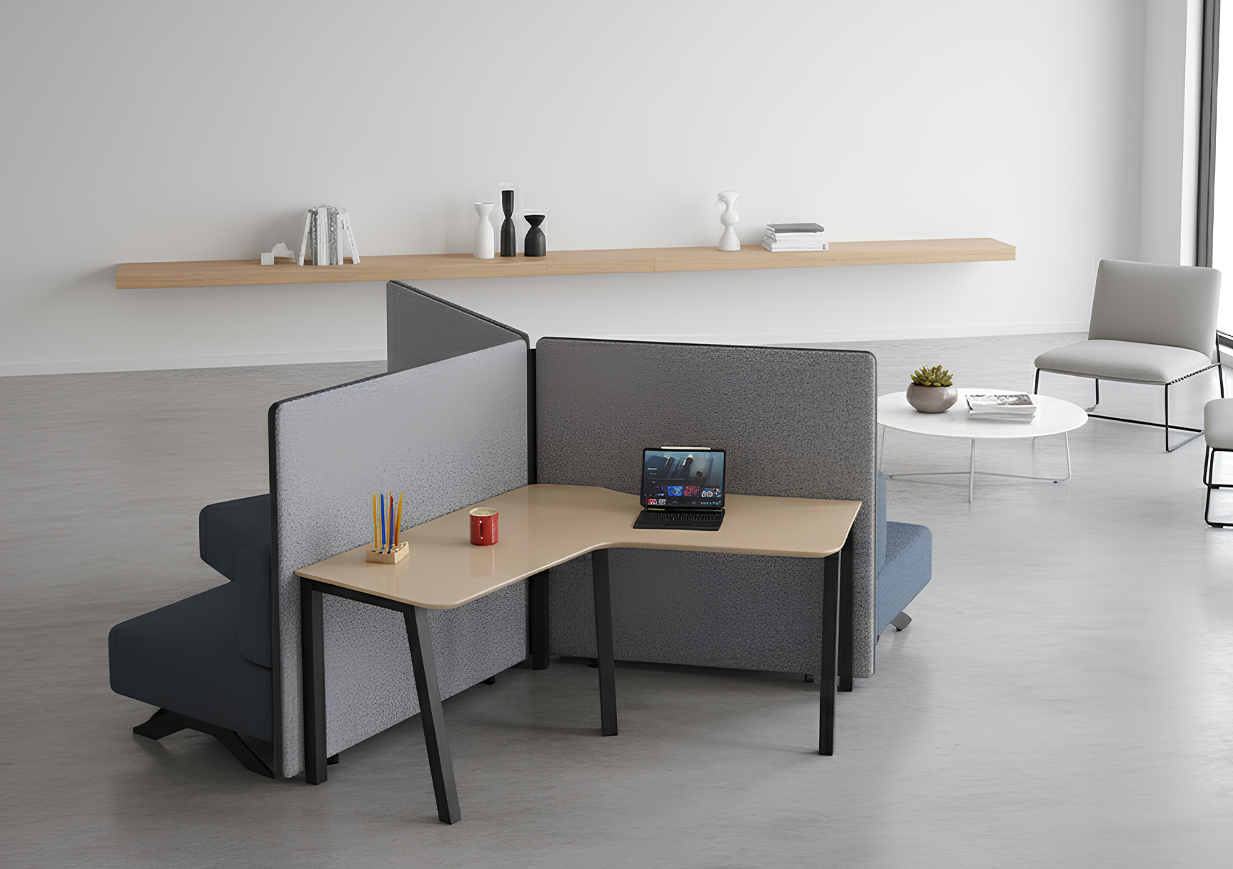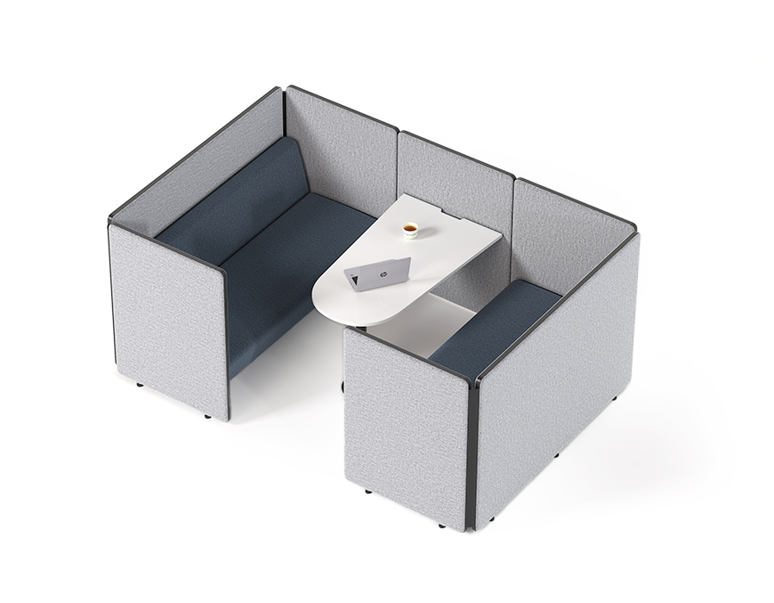 High upholstered panels reduce sound transfer, creating a quieter, more focused environment for effective conversations and deep work.