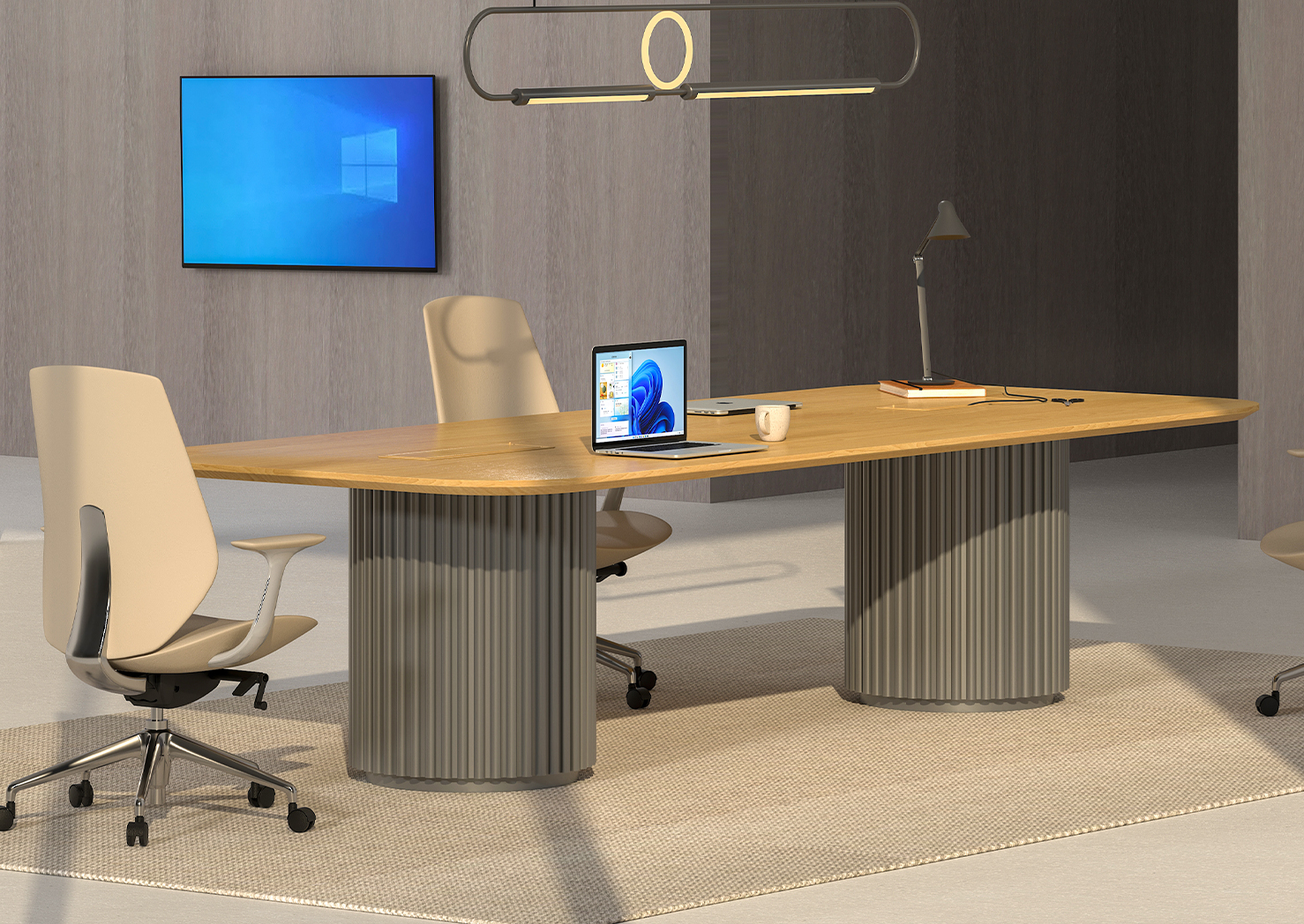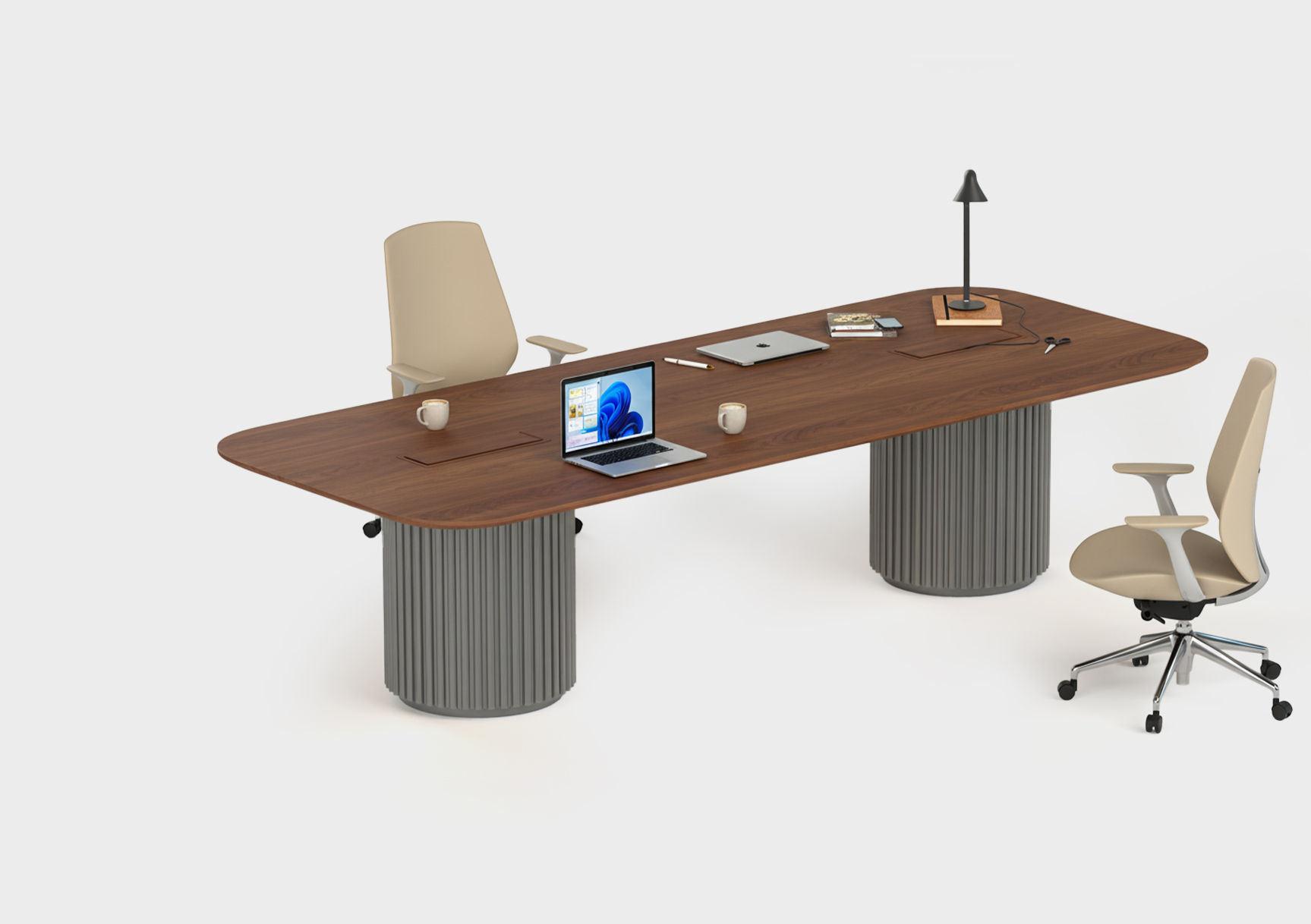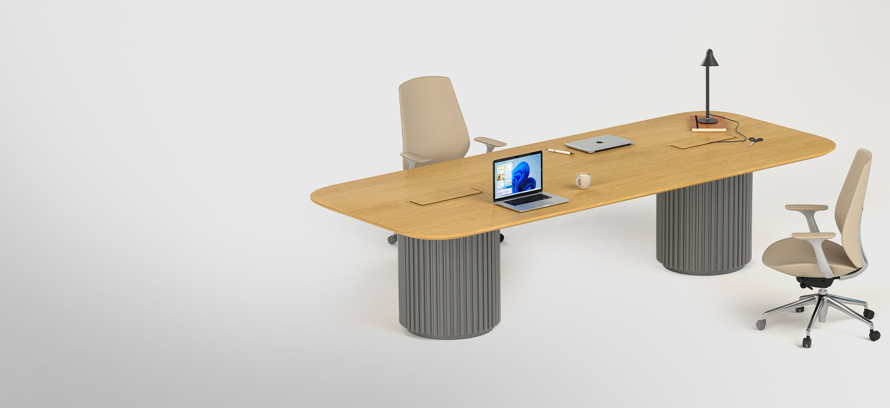 Sculpted column bases introduce architectural grace, while premium finishes and integrated power access enhance convenience. The result is a seamless, sophisticated centerpiece designed for the modern meeting space.