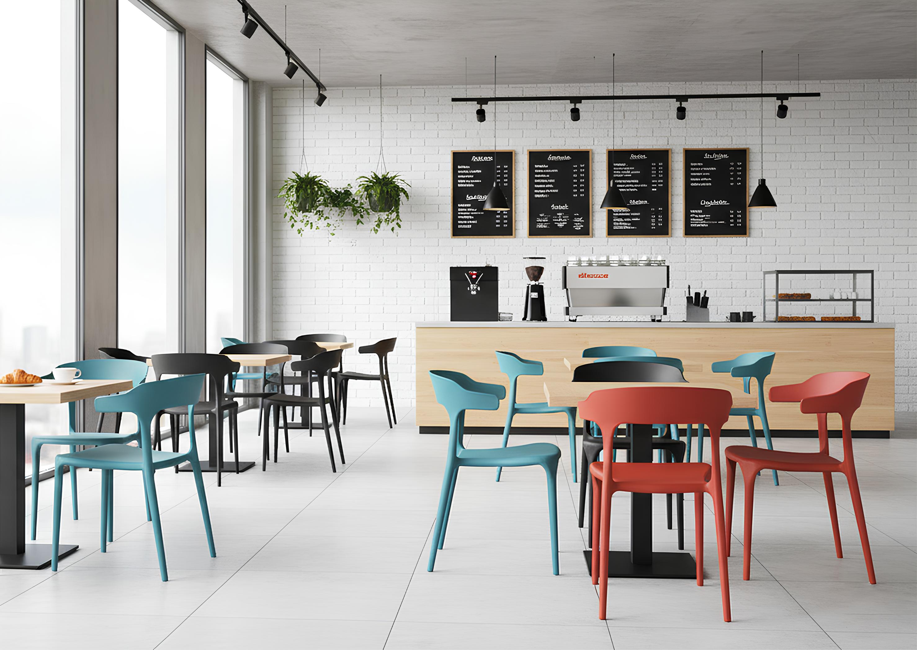 This lightweight, one-piece chair features smooth curves and an airy open back design that blends comfort with contemporary style. Durable, versatile, and effortlessly sleek, it adds a refined finish to cafés, work zones, and dining interiors—perfect for a standout brochure showcase.